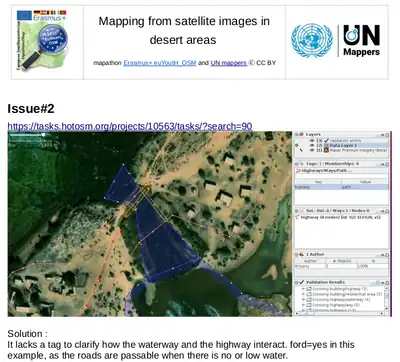 It lacks a tag to clarify how the waterway and the highway interact. ford=yes in this example, as the roads are passable when there is no or low water. | |