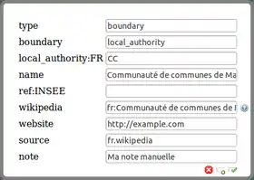 Dans l'éditeur, chaque *tag apparaît sur une ligne avec sa *clef et un champ de saisie pour la valeur. Certaines valeurs sont déjà pré-remplies selon le type d'entité à définir.