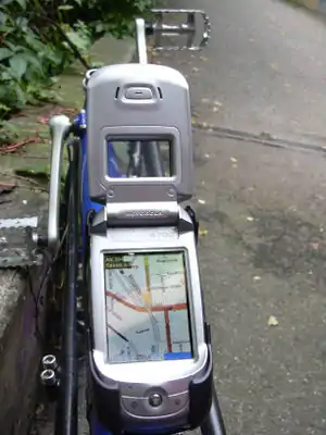 Motorola A780![]() Motorola A780 Linux-Smartphone showing the OSM map of Ludwigsburg with BikeAtor The Motorola A780 mobile phone with build-in GPS receiver can be used with the BikeAtor-Software to track GPS. New versions of BikeAtor directly store tracklogs in GPX format compatible with JOSM. The original battery only lasts about 2 hours, but of course it could be replaced with one of a higher capacity to easily double the time. Other devices might give more exact results, but keep in mind: It's a cellphone with full navigation on board! No need for thinking about if you will or won't need your GPS - it's there, because you won't leave your cellphone at home, will you? Mio P550Mio P550 is a PDA that runs Windows Mobile 5. It has a built-in GPS module with the SiRFstar III chipset. It´s possible to attach an external antenna. The device also features Bluetooth and WLAN. Car mount is included in the package. The device can be bought with or without included maps and navigation software from MIO. A few of the devices sold before August 2006 had a problem with weak signal level, but the problem has now been acknowledged by Mio. Questions about the device can be asked to user:eriso