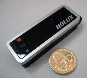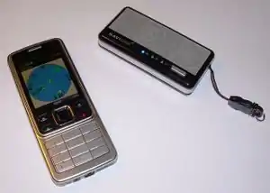 Works very well in combination with gpsd on Linux. Very cheap, but comes with minimal documentation and without software. It is also possible (although unlikely, and this is not a specific risk for this particular device but probably for each "gpsmouse" device) to mess up the settings in such a way that one cannot connect any more with the device, leaving one no solution but to open it and disconnect the battery (which is soldered) to reset the device to its factory defaults. Of course this voids your warranty. See also the utility SirfDemo. Navilock BT-359![]() Navilock BT-359 beside a Nokia 6300 running GPS Track It's the same as the Globalsat BT-359 (except the logo). Connection: Bluetooth