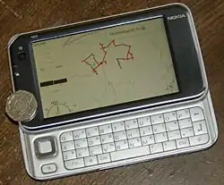 Includes DC-4 car charger, is compatible with the default Nokia AC-4E charger. The SiRF chipset is by default in "static navigation" mode, so doing mapping at anything under highway speeds will be a bit of a pain without changing the setting. Nokia Smartphones (general)Nokia E90 running Sports Tracker Application The Nokia N95, N79, N810, E71, E90, 5330 XpressMusic, 5800 XpressMusic, 6220 Classic & 6110 (among others) have built-in GPS unit. It's useful have an up-to-date version of the Nokia software that uses AGPS to substantially speed up start up times (without the update, every time the GPS gets activated, it needed to perform a 'cold start' and download full almanac data from the satellites, which took several minutes). According to Nokia, on the N95 you get the best reception by sliding the keypad out, then holding the phone upsidedown, so that the numeric keypad is at the top, and has a clear view of the sky. However, once the phone has a GPS lock, it's fairly good about holding it when you close the keypad, and hold the phone. At least all Nokia smartphones based on Symbian S60 3th or 5th edition phones will communicate with external GPS devices using Bluetooth. There are many free alternatives for capturing GPS tracks. You can also geotag photos taken using these phones using Nokia's free Location tagger software.