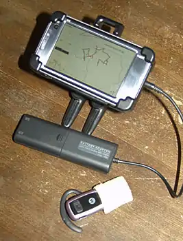 Nokia N810 (Internet tablet)![]() Nokia N810 showing slide out keyboard ![]() Nokia N810 with bluetooth headset, adapted mounting bracket, and external battery pack Nokia N810 is sold as an "Internet Tablet". It is a pocket size Linux computer with a built-in GPS, wlan and USB connectivity, Bluetooth, sound in/out, a not very useful camera, tiny but very functional keyboard, and a much higher resolution (touch screen) display than e.g. the Apple iPod Touch which is probably the main competitor (though not in our field because that doesn't have a GPS). It's 13×7×1.5 cm approx and comes with a car bracket (which can be adapted for bike handlebar mounting with some ingenuity). Note it *doesn't* include a mobile phone (though you connect through one using Bluetooth). As well as the 2 GB solid state disk, there is a miniSD card which makes storage expandable. You would be hard put to fill 8 GB of card with tracks, but voice notes run at about 60 MiB per hour. It's comparatively expensive a solution, though no doubt second hand ones will start coming on the market in due course. However, if you are using audio notes (recommended, see below), the device can record these for you as well, so you don't need a separate dictaphone. The use of the GPS is highly dependent on which software is used. At the moment, OSM mappers will want to install Maemo mapper. This records and displays tracks over a map background which is OSM's Mapnik by default. Unless started in the same place as it was previously stopped, the GPS/Mapper takes quite a long to to get a fix, but once it has it is nicely dense and apparently pretty reliable (though is just as vulnerable to woodland and tall buildings as other GPSs). I (David.earl) have found a very efficient way to use it is with a Bluetooth headset (with the microphone covered with a bit of washing up sponge to suppress wind noise) to record continuous audio, and an adapted version of Maemo Mapper which provides for a single touch anywhere on the screen to make auto-numbered waypoints (so I can use gloves - essential on a bike in winter). The absence of wires is a big plus. The battery life can be a problem. It is about 4.2 hours with the display on continuously (presumably this will degrade as the battery ages). Obviously you could carry a spare battery, but I bought a cheap AA battery cage which means I can power it on external rechargable NiMH batteries if the built in one runs out. 4 hours of urban mapping at one go is quite a long session anyway through. On the whole it has been pretty reliable, but it has crashed once on me while surveying and meant I lost an hour's worth of tracks (I think I might modify Maemo Mapper to do a periodic autosave, but in the meantime frequent saves are recommended). I don't think you'd necessarily buy this just for mapping, but if you want a mobile browser, media player, note taker, navigator, PDA etc, this could be a good solution for you. I certainly like it. Footnote: Maemo Mapper currently seems to have a track limit of about 5 MiB in a single track. (AC7SS) Nokia N800 (Internet tablet)The predecessor to the N810, this device deosn't have a GPS. But used with a bluetooth GPS, you can get to use pretty much the same combination of software as the N810. The advantage is the much lower cost. Progin T-368![]() Progin T-368