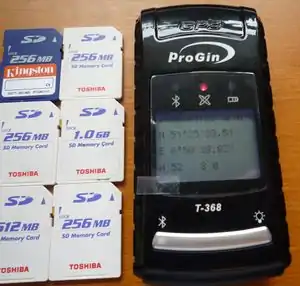 Logging format not clear. The manual states "By connecting the ATP Photo Finder directly to your PC via USB connection, you can back up all the logged GPS position information" but does not indicate the data format. Logging frequency not clear. The manual says "logging interval Approx. 5 seconds" (p. 11) and "Update rate Continuous operation: 1 Hz" (p. 14). Billionton CF-card(by user:imi)![]() Billionton CF-card after a ski downfall. That's what I mean by "fragile". The serial CF card for PDAs and Laptops work out of the box with most Linux systems. It is the recommend card from Trisoft (The place to get the European Zaurus from). Since it is a serial CF card, it has problems with an unpatched Zaurus C3100's serial bus driver shipped with the standard Sharp ROM. Avoid using this device with a Zaurus C3100.
