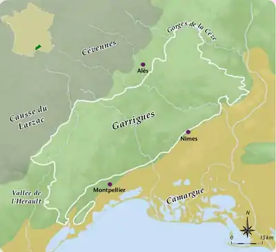 Le mot "garrigues", parle ici territoire des garrigues, et ne se limite pas seulement à la lande épineuse et odorante qui en constitue une des identités que ce terme évoque. Sur ce territoire, il y a des milieux naturels mais aussi des villages, des cultures, des troupeaux, des savoir-faire... C'est l'arrière-pays sec méditerranéen avec toutes ses composantes naturelles et humaines.