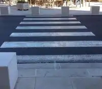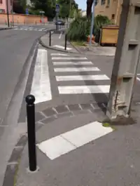 tactile_paving incorrect Surface podotactile (bande podotactile) mal placée, ou non sécurisée, ou manquante sur l'un des côtés du passage piéton.