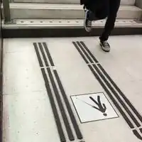 - changement de niveau : un escalier peut avoir une bande d'éveil à la vigilance avant les marches, à chaque étage il est également possible de matérialiser la bande située devant l'ascenseur (highway=elevator).