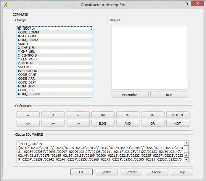 - Dans la nouvelle fenêtre : sélectionner les communes selon par exemple leur code INSEE (Source possible, Source possible 2016).