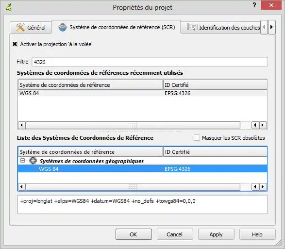 - Sélectionner la ligne "WGS84"