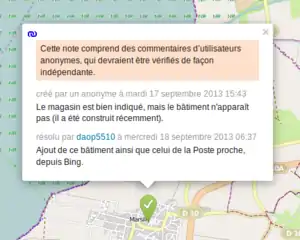 Notes est une fonction du site web OpenStreetMap.org ajoutée en avril 2013. Les visiteurs peuvent "Ajouter une Note" facilement pour signaler une erreur dans les données.