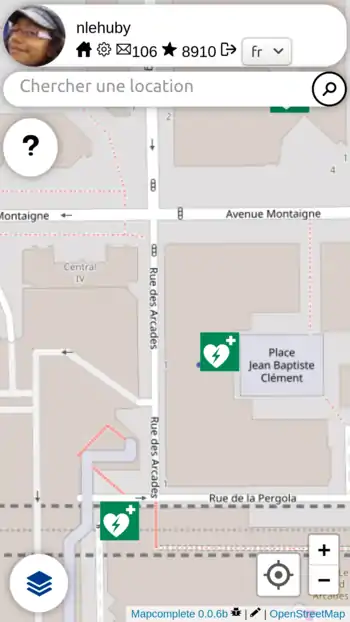 - Dans les applications mobiles, afin de trouver le défibrillateur le plus proche : Maps.me, OsmAnd, MapContrib...