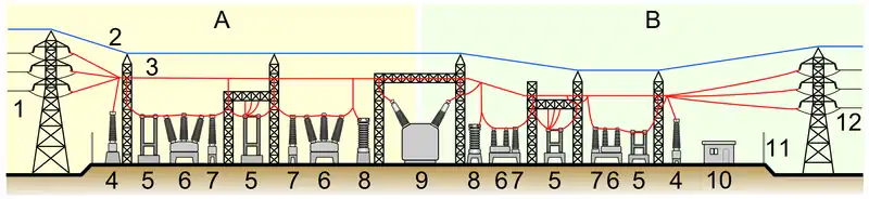 - power=substation représente une zone qui peut contenir des transformateurs. Ces zones englobent souvent des jeux de barres et d'autres appareils de protection.