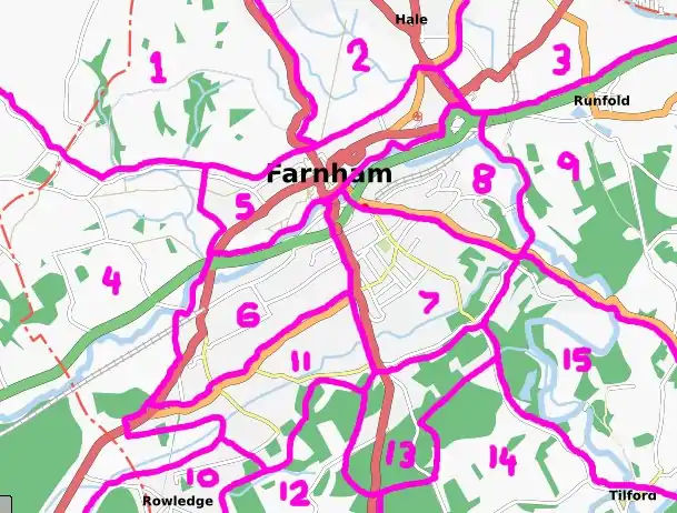 Farnham is served by railway to Waterloo (via Clapham Junction too, usu. platform 9), trains every half-hour during non-peak hours and slightly more frequently at rush-hour. Head down the hill from the station, over the A31 dual carriageway and keep going straight til you hit the town centre. There are busses to Guildford and a National Express coach stop in the centre (the main stop is outside the Queen's Head pub near the east end of Borough, and Costa is mere seconds walk further west near the top of Downing Street on the same side).