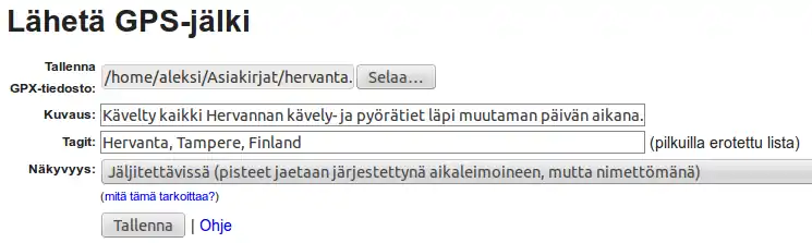 - Tagit - Reitin paikkaa kuvaavat hakusanat. Nämä tulevat näkyviin reittilistausikkunan vasempaan reunaan. Huom! Hakusanat on erotettava toisistaan tyhjällä välillä, pilkku hakusanojen välissä estää tiedoston latauksen ja johtaa virheilmoitukseen.