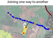 - Jos haluat päättää toisen tien risteykseen (ns. T-risteys), kaksoisnapsauta haluamaasi sinistä pistettä. Jos viiva jatkuu vielä, napsauta sinistä pistettä kerran ja viimeistele viiva loppuun.