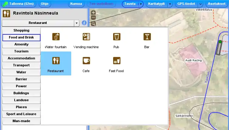Viivojen luomisen ja muokkaamisen lisäksi kartalle voi lisätä muitakin kohteita - kauppoja, kaupunkien ja kylien keskustoja, huoltoasemia, nopeuskameroita ja muuta vastaavaa.