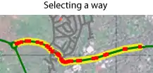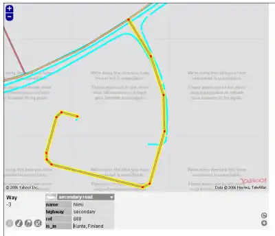 - Olemassa olevaa tietä voi siirtää kokonaisena napsauttamalla sen ensin aktiiviseksi ja vetämällä sitten pisteiden välistä. Tie siirtyy helposti myös vahingossa. Vahingossa tehdyn siirron voi perua napsauttamalla Kumoa. Peruminen saattaa kestää joskus kauankin, koska muokkausohjelma käy ilmeisesti noutamassa muokkaamattoman version uudelleen palvelimelta, mutta sitä kannattaa odottaa.
