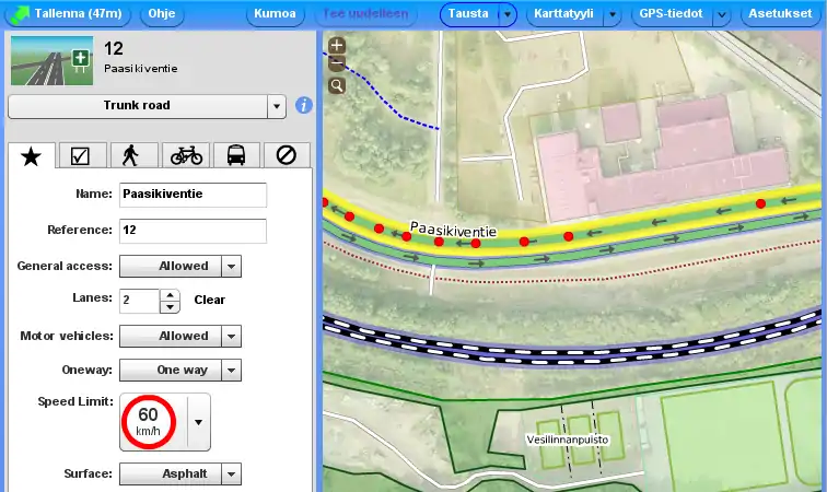 - Oikean alareunan valikossa on nuoli. Sitä napsauttamalla tien suunta muuttuu tai voit tarkistaa, että tien asetus on oikein. Parametri "oneway=-1" kääntää tien nuolen suuntaa vastaan.