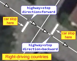 asetetun highway=stop-ominaisuustiedon katsotaan tarkoittavan pakollista pysäyttämistä lähestyttäessä kyseistä pistettä lähinnä sijaitsevaa risteystä. Jos lähekkäin on useita risteyksiä ja on mahdollista sekaantua siitä, mitä ajosuuntaa tai mitä risteystä stop-merkki koskee, lisätään direction=forward tai direction=backward osoittamaan suunta, jonne stop-merkki on suunnattu. Forward tarkoittaa viivan suuntaan ajavalle liikenteelle suunnattua liikennemerkkiä ja backward viivan vastaisesti ajavalle liikenteelle suunnattua liikennemerkkiä. Katso Forward and backward (englanniksi).