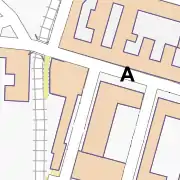 ![]() | highway=residential | highway=footway surface=unpaved (optional, if applicable) | Way B signposted with the traffic sign 421 "Footway" | |