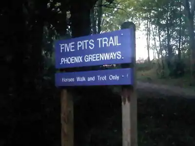 The Five Pits Trail runs for just over five miles between Grassmoor Country Park south of Chesterfield and Tibshelf Ponds, where it joins the Silverhill Trail. The trail runs mostly on abandoned railway lines (the Great Central Railway and also earlier colliery railways).