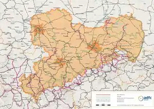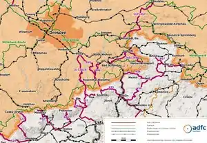 - Bicycle routes (SachsenNetzRad from SMWA, available as Shapefiles), converted using JOSM-plugin Import/Shapefile
