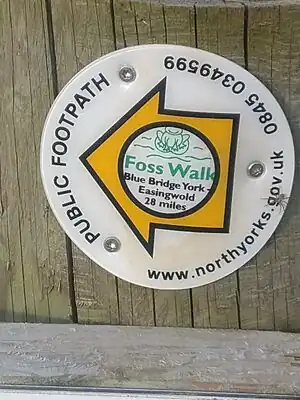 The Foss Walk (or as the pictures on some of the signposts call it, the Foss Way) runs alongside the River Foss from its confluence with the Ouse at Blue Bridge to its source near Easingwold.