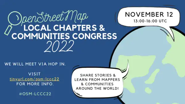 AboutThe Local Chapters and Communities Congress 2022 (LCCC 2022) is a virtual event where leaders and members of various OSM communities, whether they are officially recognized Local Chapters of the OSM Foundation or just a regular user group of OSM mappers, come together to share stories and learn from each other. Let’s get together and see what kinds of organizational efforts we can share together to support and grow our mapping communities! Check out last year's event! When