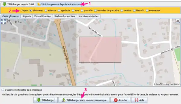 Téléchargez les données OSM de la zone souhaitée, puis avec le même bouton, changez d'onglet pour télécharger les données du cadastre : pensez à ne sélectionner que celles qui vous intéressent (eau permet d'importer les piscines privées). Attention, chargez ces nouvelles données dans un nouveau calque.