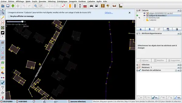 Il est ensuite indispensable de lancer le validateur OSM pour corriger tous les cas problématiques que la «conflation» a générés, notamment les cas de :
