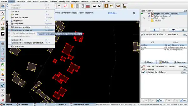 - Avec l'outil de validation, on vérifie les collisions éventuelles issues de la fusion (bâtiment-bâtiment, bâtiment-route, bâtiment-rivière, etc.)