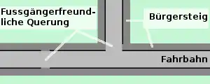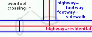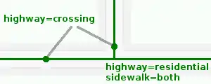 Hinweis: Der folgende Abschnitt ist aus dem Benutzerseiten Bürgersteigrouting von user Maxbe übernommen, da dieser diese Problematik bereits sehr gut illustriert und beschrieben hat. Zwei verschiedenen Arten, Gehwege zu mappenEs gibt zwei Möglichkeiten, Bürgersteige zu erfassen: ![]() ![]() Getrennt: Man zeichnet den Bürgersteig als eigenen Weg mit highway=footway ein. Zur Unterscheidung von anderen Fusswegen, die keine Bürgersteige sind, wird diesem Fussweg noch ein Attribut "footway=sidewalk" mitgegeben. Überquert dieser Fussweg eine Strasse wird die Kreuzung wie jede andere Strassenkreuzung behandelt: Es gibt einen gemeinsamen Punkt, der zu Fussweg und Strasse gehört. Eventuell wird dieser Punkt oder der gesamte Fussweg auf dem kurzen Stück der Querung als Ampel oder Zebrastreifen gekennzeichnet oder mit zusätzlichen Beschreibungen zum Bordstein oder ertastbaren Markierungen versehen. ![]() Zusammen mit der Strasse: Man hängt einfach noch ein Attribut "sidewalk=left/right/both" an die Strasse. Besondere Querungsmöglichkeiten werden durch einen Punkt auf der Strasse gekennzeichnet, der ebenfalls Beschreibungen zur Art des Übergangs und zum Bordstein bekommen kann.