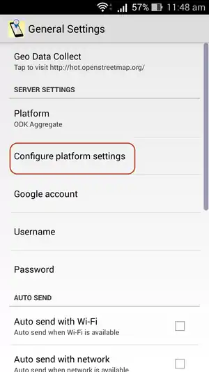 - Then click on the top right corner to make the settings, click General Settings, click Configure platform settings and appears ODK Aggregate Settings page.