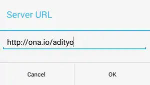 - To insert the survey form which we have made previously, click URL menu and insert the URL of survey form in Server URL, for example http://odk.ona.io/adityo, then click OK.