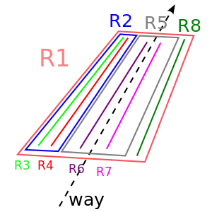 Die Spuren in diesem Versuch eines Datenmodells gehen von links nach rechts in Richtung des Wegs. Wenn man die Richtung eines Wegs umdreht, sollte ein Editor nachfragen, ob er die Reihenfolgen und Richtungen der lanes mitdrehen soll oder nicht.