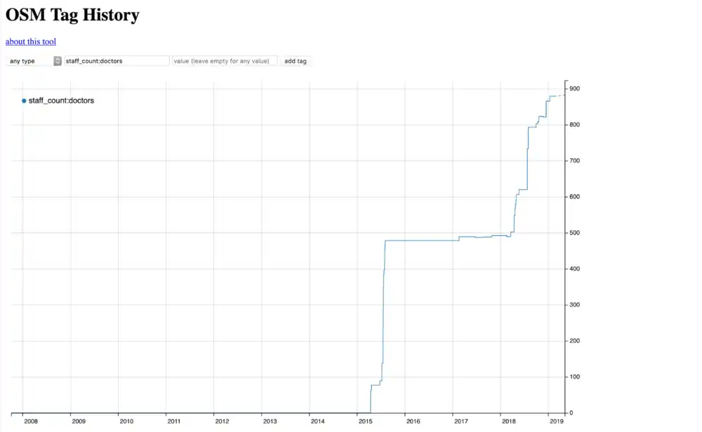 The extensive wiki page Healthcare 2.0 put together by OSM user Fabi2 was reviewed and re-purposed where it made sense. We wanted to ensure that the work by Fabi2 was not overlooked and although very detailed, only extracted the parts that were required by the Healthsites.io model. The tags ‘staff_count:doctors’ and ‘staff_count:nurses’ was initially proposed by Fabi2, but unfortunately the whole page has been listed as abandoned. There are 882 features using both of these tags, based on the statistics from Tag Info, which is predominantly based in Africa. Looking at Tag History, it looks as though there was an initial bulk import but the use of both tags has steadily increased over time.