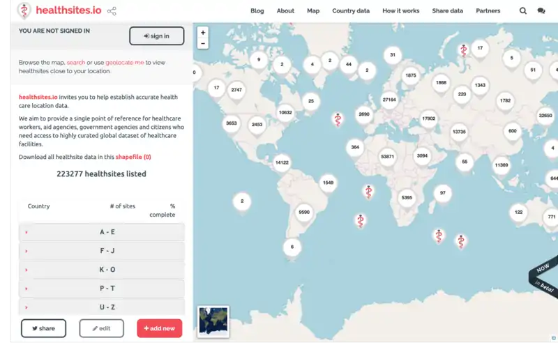 When a natural disaster or disease outbreak occurs there is a rush to establish accurate health care location data that can be used to support people on the ground. This has been demonstrated by events such as the Haiti earthquake and the Ebola epidemic in West Africa. As a result, valuable time is spent establishing accurate and accessible baseline health data. Healthsites establishes this data and the tools necessary to upload, manage and make this data easily and readily accessible.
