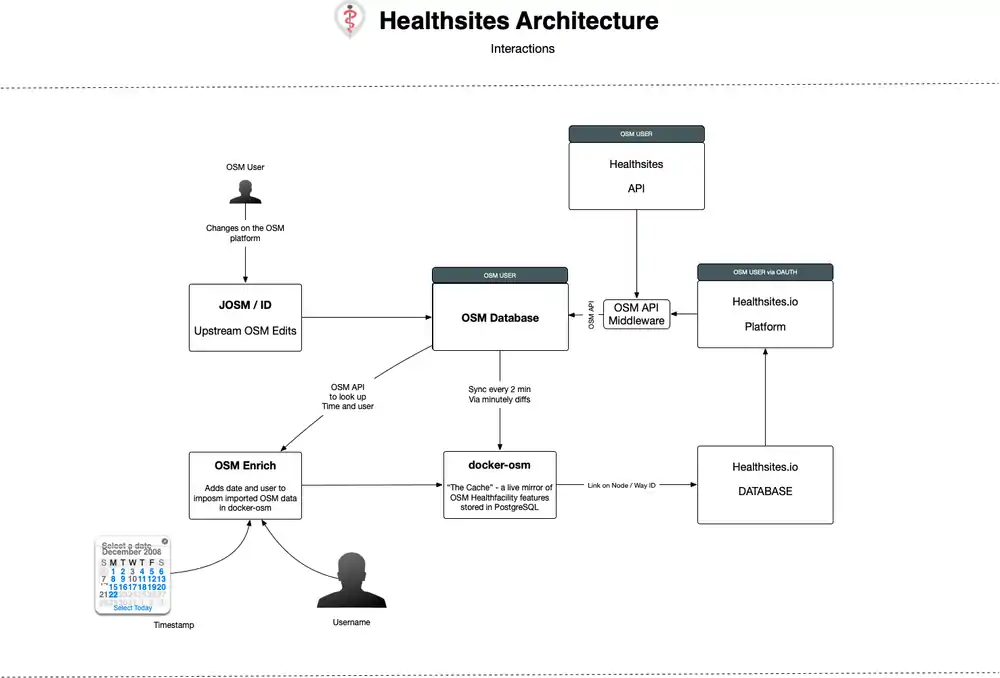 Changes to health facility data made outside of the Healthsites.io platform, and directly to OSM are replicated back in near-real time to a Healthsites.io mirror of all health facility data found in OSM. This is achieved using docker-osm, developed by Kartoza which takes the high frequency diffs produced on OSM and applies them to a PostgreSQL / PostGIS database hosted on Heathsites.io. Changes made locally on healthsites.io are first pushed to OSM via the OSM API and then replicated back to our docker-osm instance using the same mechanism described above.