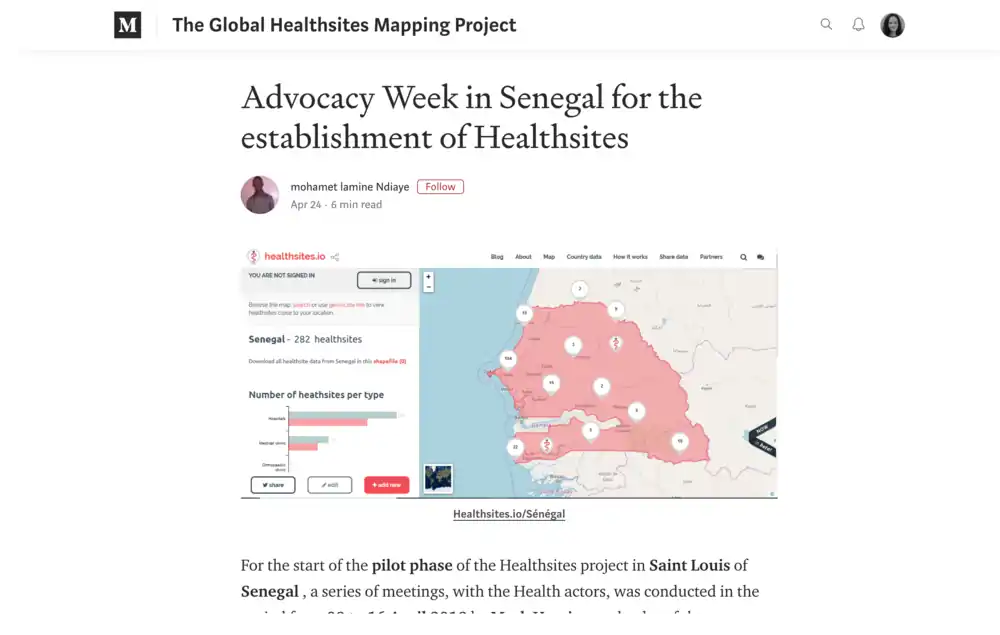 The Healthsites.io initiative is global in scope. A pilot data collection effort on the ground in Senegal is taking place in July 2019, which will look at using a localised version of the OpenStreetMap data model put together for Healthsites.io. More information can be found on their dedicated OSM wiki page, please jump to the Ground Survey section under Data Creation to read more about the pilot in Saint Louis, Senegal.