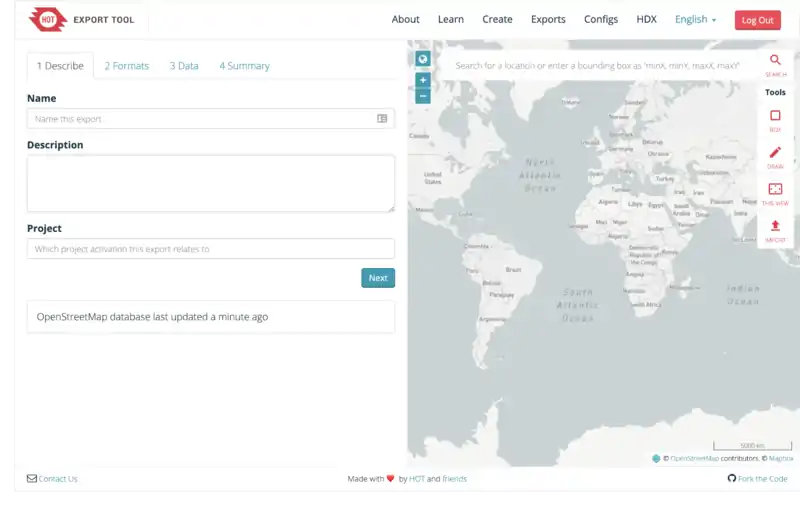 The Export Tool is another platform where health facility data can be easily downloaded. Developed by the Humanitarian OpenStreetMap Team, the Export Tool is an open service that creates customised extracts of up-to-date OpenStreetMap data in various file formats, including GeoPackage (.gpkg), Garmin (.img), Google Earth (.kml), OSM (.pbf), MAPS.ME (.mwm), OsmAnd (.obf) and MBTiles (.mbtiles).
