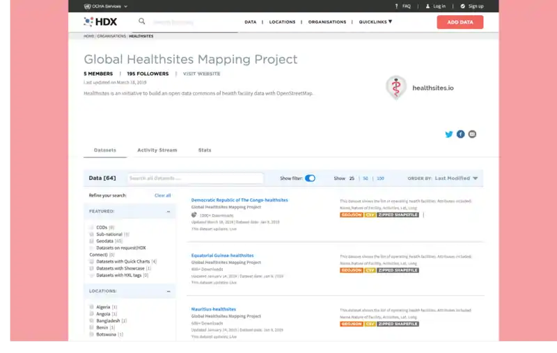 Health facility data can be downloaded from the Humanitarian Data Exchange (HDX) platform. Healthsites is registered as the Global Healthsites Mapping Project and hosts country datasets for health facilities, which can be downloaded as a GeoJSON, CSV and/or Shapefile.