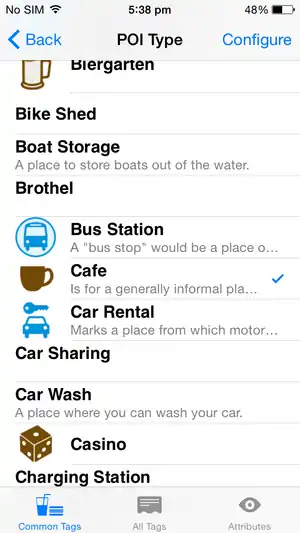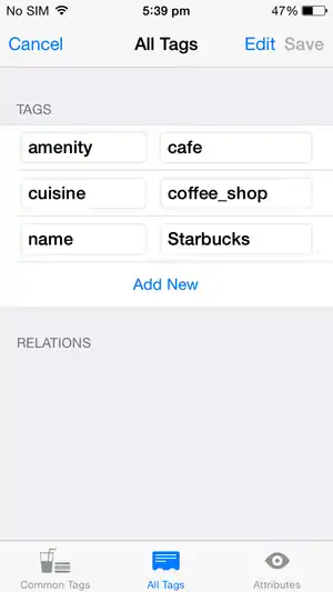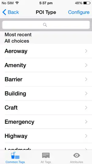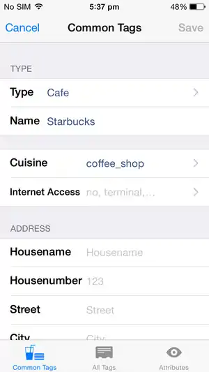 Tags are used to describe objects in the OpenStreetMap database, such as indicating that a location contains a shop or restaurant and what it's name is. To select an existing object, either a node or a way, simply tap it. To select a building, you must select a wall rather than the center. Selected objects are highlighted in yellow and display a title (gray box) and a configuration button (blue triangle). Press the configuration button to view and edit tags. The tag editing screen presented has three tabs of views. The first view (Common Tags) presents fields for adding common points of interest: