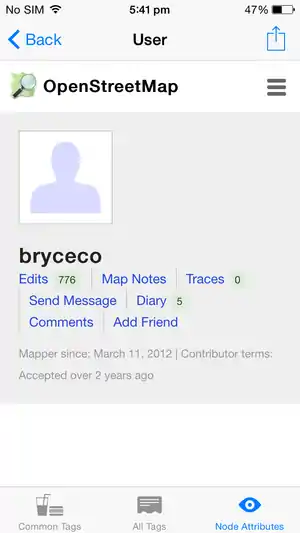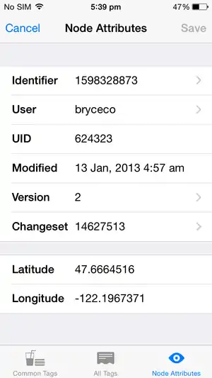 The third tab screen shows metadata about the object: who created it and when, and additional low-level details. From this screen you can also drill down to information stored on the OSM server about the user, change set, object history, and object details: