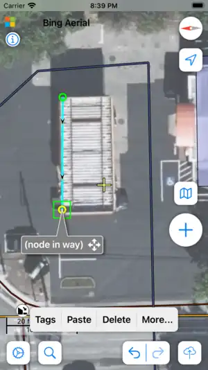 To create a new node or point of interest tap the "+" button. A pin will drop indicating the position of your new node. Drag it (using the title bar) to the correct location, then press the Tags button to add tags. If you don't add any tags then your new node will be discarded, so if you drop a pin by accident simply tap elsewhere and it will disappear.