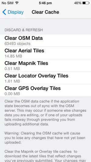 The 'Clear Cache' option can be used if you've downloaded a bit too much data for your iOS device to handle and things are becoming sluggish. It is also useful if your data is not in sync with the OSM server and you want to simply start fresh.