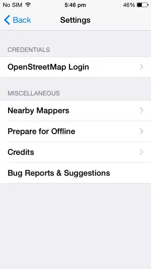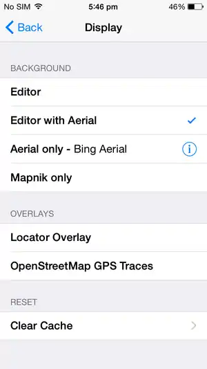 The settings button allows you to configure various aspects of Go Map!!. You can change the background to show just the editing layer, the editing layer plus Bing aerial photography, just Bing or just Mapnik (OpenStreetMap's default map rendering engine).