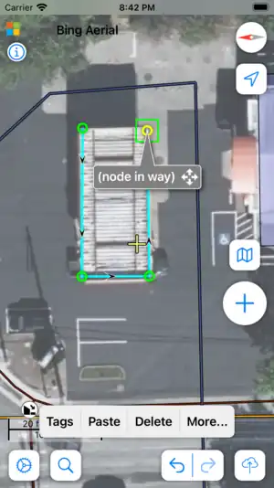 Creating a new way or area is similar to creating a node, except you press "+" twice. On the first press a pin will drop which you can position as desired, then tap "+" again to add a second, connected node. Position the second node and continue pressing "+" to add additional nodes. To create an area simply drop a final node and then drag it on top of the first node. A circle of dots will indicate that it is joining to the existing node. You can also join to existing ways by dragging over them.