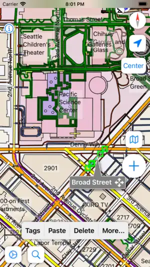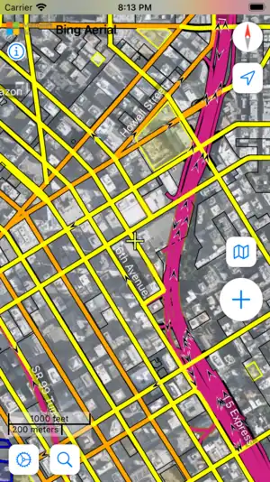 When you first start Go Map!! it will prompt to use your device's GPS to determine your location. Say "allow" and it will zoom to your position and download the satellite and OpenStreetMap data near you. If you live in a densely mapped area it may take a few moments to download, and if you live in a sparsely mapped area you may need to zoom out a bit to see details. Simply pinch to zoom and drag to pan around your immediate neighborhood. Go Map!! automatically downloads additional data as needed as you scroll around your location.