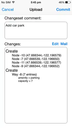 When you are finished making your changes to the map you can submit your changes to the OpenStreetMap server by pressing the upload (cloud) button. If the change is uploaded successfully, you will simply be returned to the map screen. After uploading you cannot undo to a previous state; all changes are final. If your upload fails because of a version conflict or other reason you can email the OSM change file ("osmChange.osc") to yourself to fix the problems offline.