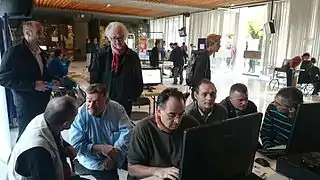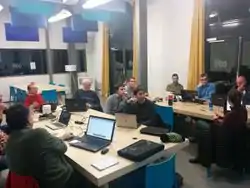 Après les "recrutements" faits à Alternatiba le 26 septembre, puis à la journée Grelibre le 10 octobre, et au Mapathon Missing Maps du 28 octobre, on a pris le temps d'accueillir les nouveaux et les débutants. L'atelier a eu un beau petit succès puisque les six "anciens" (Paul, Michel, Jérôme, Sophie, Nicolas et Guillaume) ont accueilli huit "nouveaux" : Dominique, Jean, Pierre-Daniel, Damien, Laurent, Christophe, Caroline, et enfin notre hôte Sylvain de la Coop Infolab. À noter que tous les nouveaux n'étaient pas des débutants : Jean est contributeur de très longue date, et Laurent et Christophe ont déjà commencé.