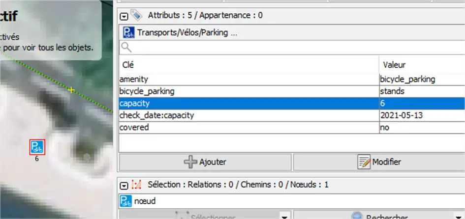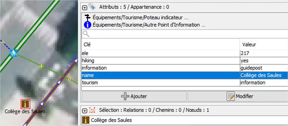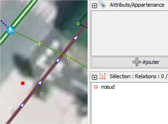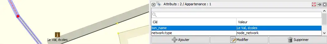 Sur le nœud représentant le carrefour entre les chemins/routes, il faut ajouter les 3 attributs suivants comme l’image ci-dessous (le 3ème attribut étant facultatif, mais utile pour des calculs d'intégrité du réseau) :